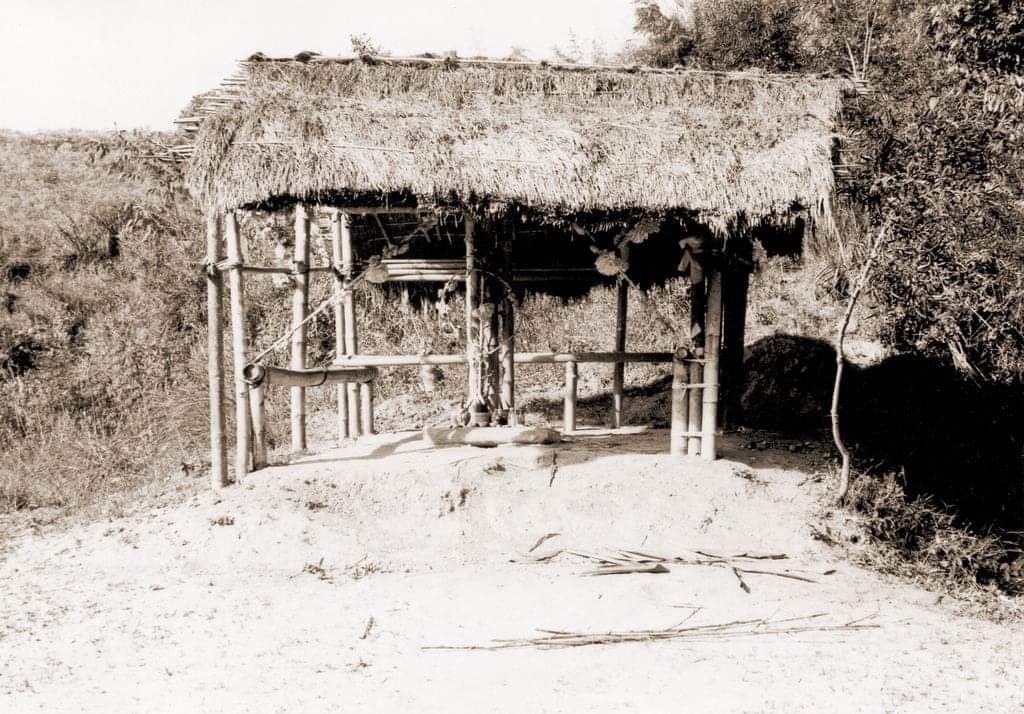 | 1957年劉斌雄教授與劉枝萬先生攝於白河險潭公廨(原位於鰗溜坑現白河水庫大壩前),該公廨夯土為基,以竹為主體骨架,再以竹片夾草茅,逐次由下而上疊覆屋頂,公廨四周則無任何遮擋或簡易牆堵 |