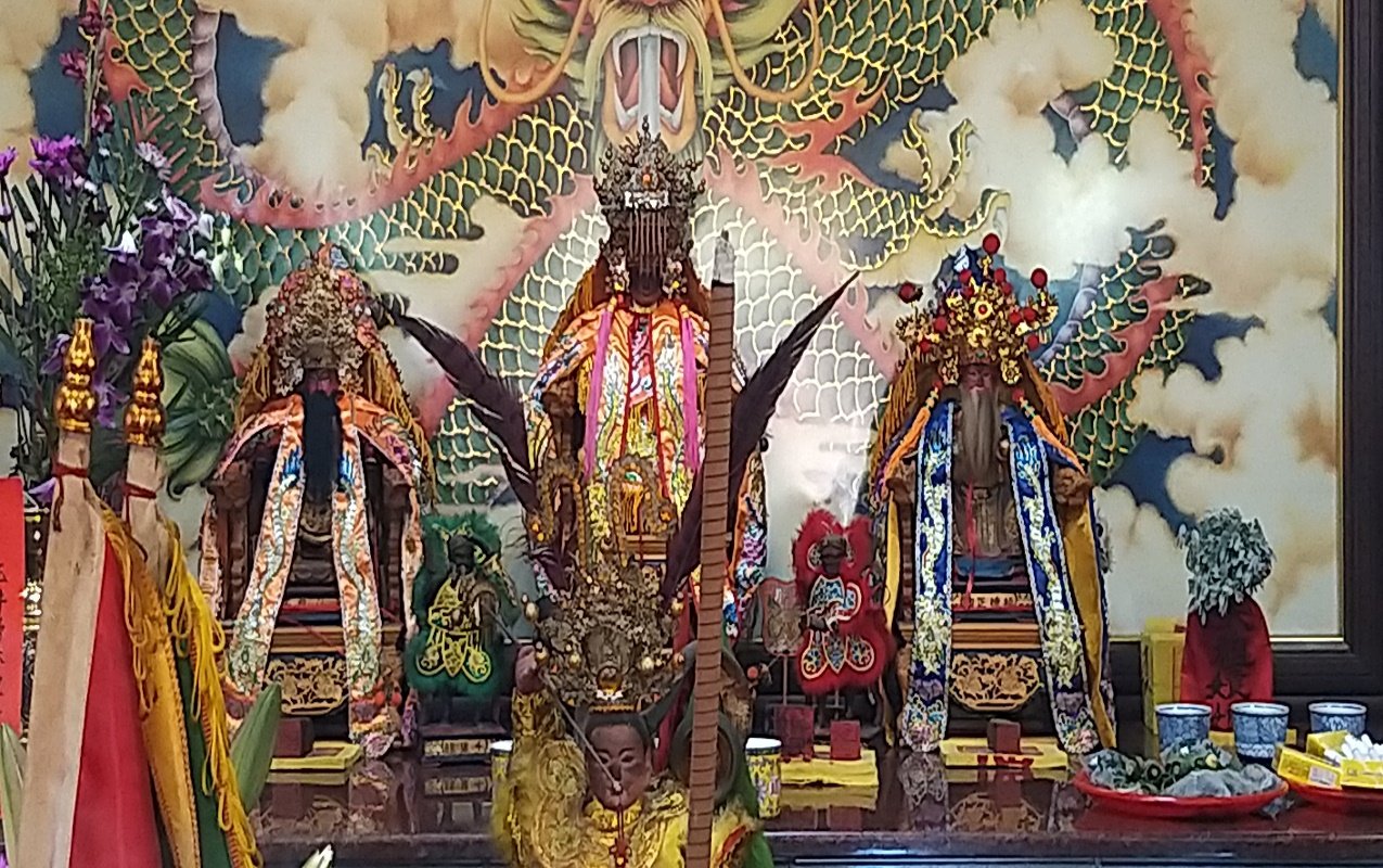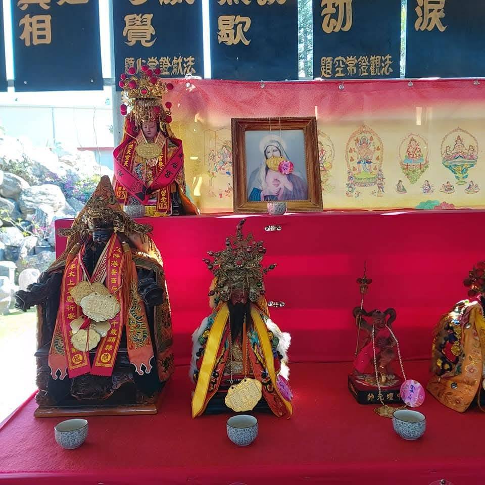 | 2020年楠西懸空法寺萬教節,案上有民間信仰的神明、天主教聖母瑪莉亞像、老君祖(已神像化) |
