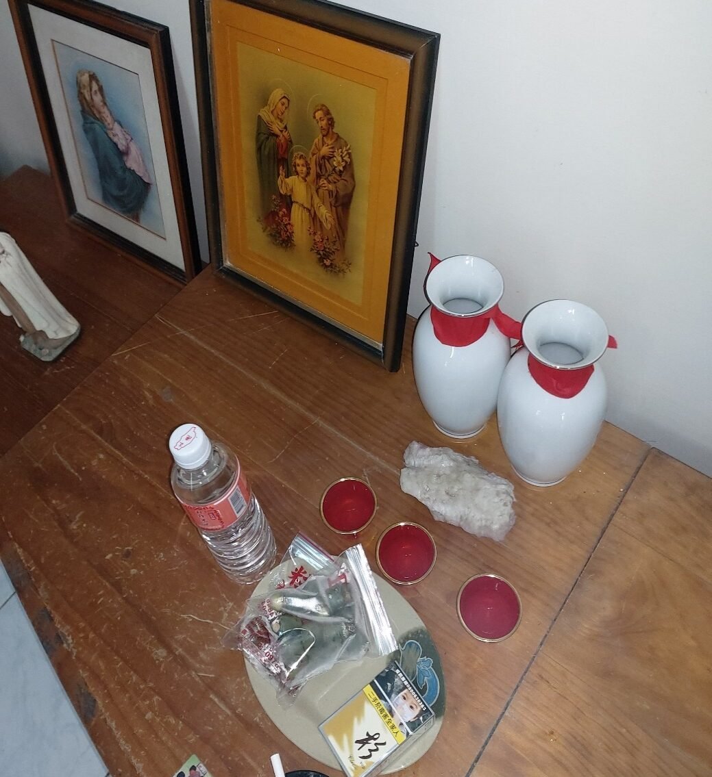 | 2021年聖母瑪莉亞及老君祖合祀於P姓天主教徒家中三樓 |