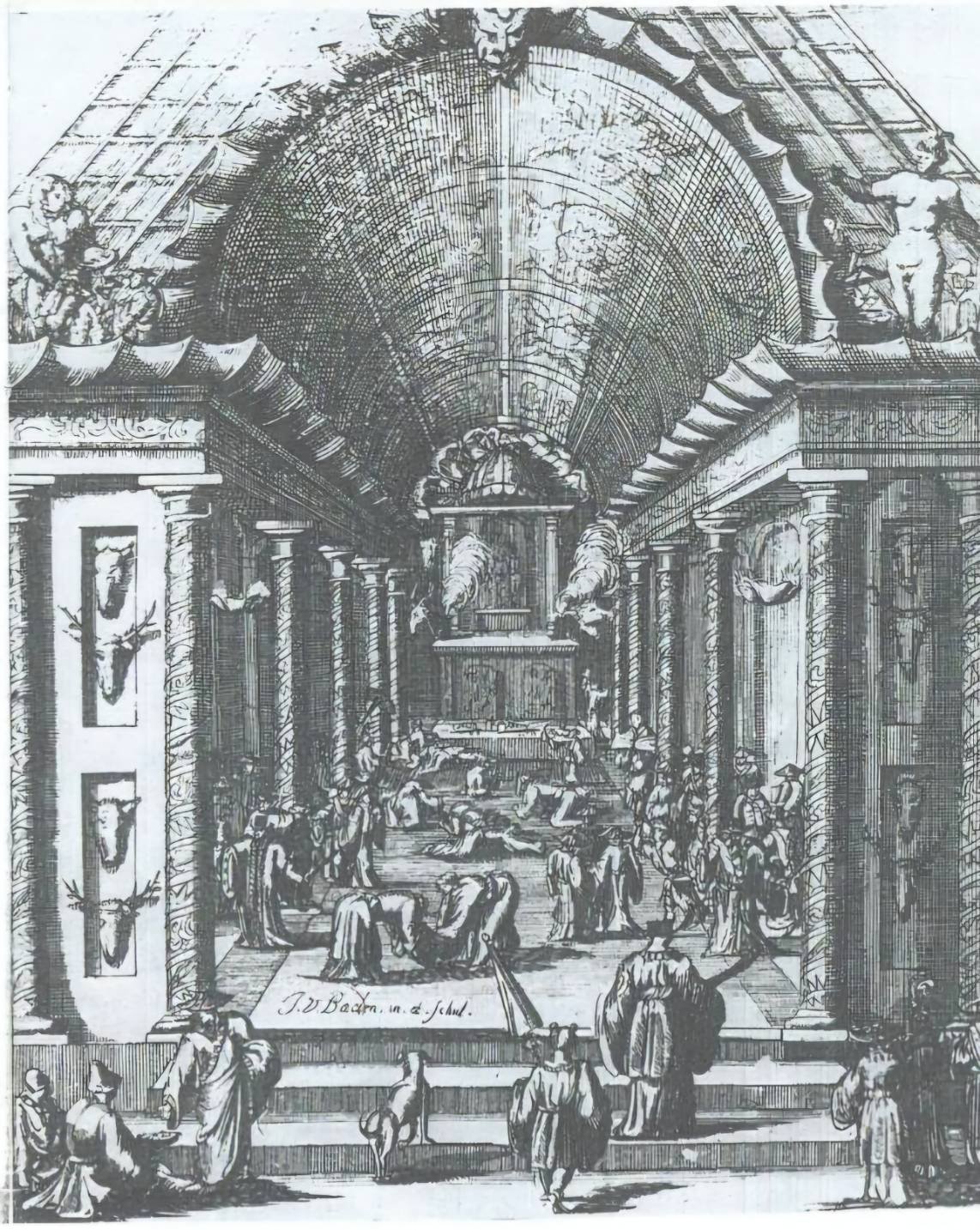 | 荷蘭尤紐士(Robertus Junius)牧師為蕭壠社人宣講及施洗圖,該畫純屬以阿姆斯特丹教堂格局所繪之意象圖。 |