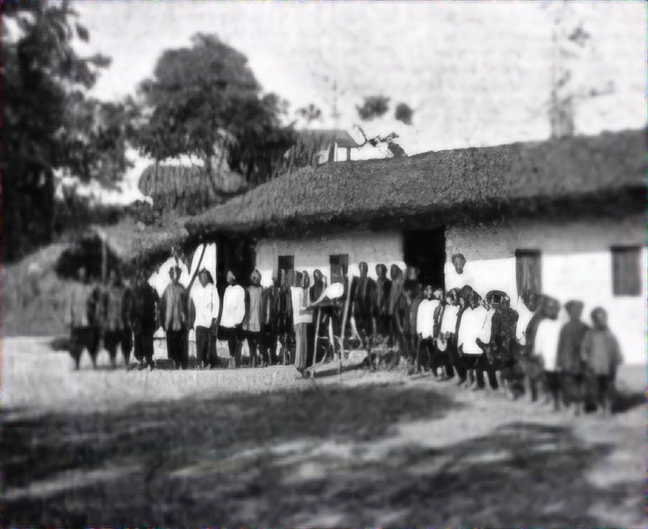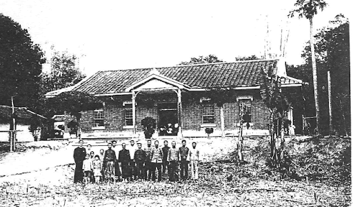 | 1916年攝於玉井層林(芋匏社)買氏家宅(左鎮拔馬教會層林分班),該屋以石板及夯土奠基,牆壁以刺竹為柱,片竹成編為牆 |