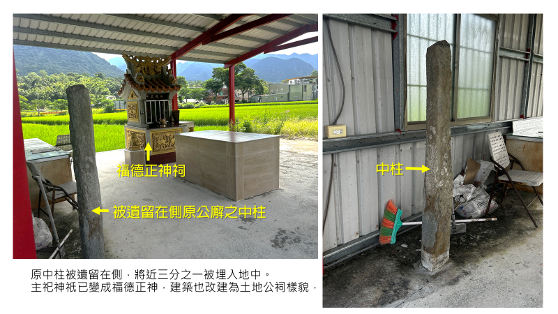 另有將平埔信仰物置於案桌下之案例,(如圖2) 除了被學者詮釋隱含尊卑、主次之分的觀點外,吾人研判有可能於日治時期,為躲避日本殖民政府對宗教信仰的管制,而暗藏於祭桌之下,雖表徵為卑下或次等,總較棄置於田邊林間為佳。除此,亦有平埔信仰場域逐漸被漢式信仰完全取代者,或因族群平等認同、婚嫁及外來信仰等影響等因素,如圖3所見石材之立柱狀物,原可能為有中柱之公廨形式(如小林、阿里關、六重溪……等),以及可能裝置於柱上不易留存之籐竹等構材選用考量。然而此桿雖因其為石材且可能深植於地下難以拔除而被留存,卻也可能改建時被當作原建築結構物與信仰無關而忽視棄置,當改採新建材與構造又對過往或異族之信仰傳承斷層或誤解時,面對建築構件同時具象徵或崇拜功能之構造,可能誤將其與原信仰功能完全錯解(認),而形成突兀地矗立角落顯得毫無功用之石柱,而被忽視地棄置於一偶,幾與掃帚同處一地之尷尬境地。(見圖3右圖)
