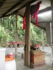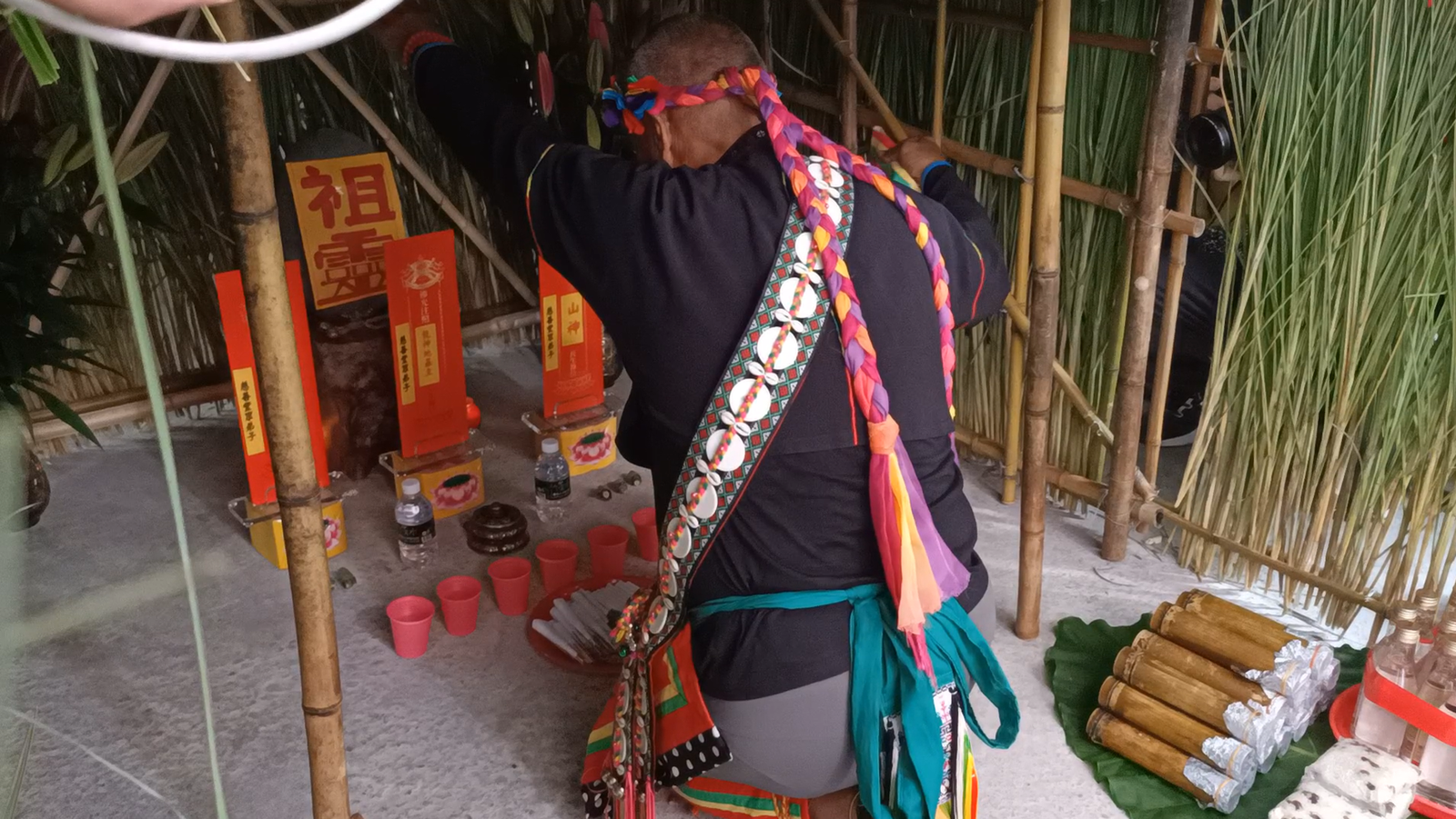 | 圖6:此與池上慈善堂不同之處,採用竹與編織竹篾(絣)為材構築三壁。祭台上佈以插菁之矸瓶 |