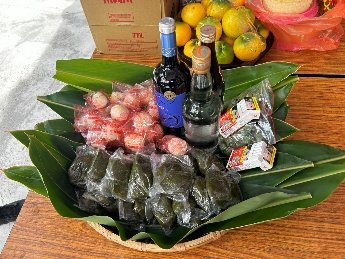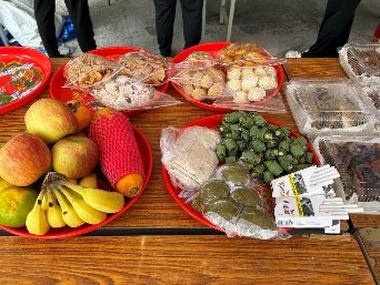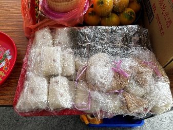 (三)祭典儀式始於由分靈在全台各地者攜祖靈,依先後回來順序同案並祀於祭台;由這些分靈者、信徒與來自四方參與民眾,共同請神觀世音菩薩等主殿之神佛祭拜,除攜回之祖靈外,並攜帶各類素食品飲品供奉,米製粿、「米買」(Mai)等。米酒、檳榔、醃製生豬肉、各類糯米小米製品則供奉於廟側臨時搭建之祭屋前空間。(圖9)
