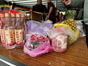 | 圖9-1:祭祀小屋前供品陳放處,以利祖靈點貢 | 圖9-2:米酒、檳榔、醃製生豬肉、各類米製品,與傳統祭拜太祖與祖靈之祭品類似 |