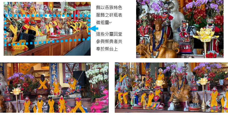 (二)慈善堂各分靈定期回來HUSA(會親)及ACEKER(類似請靈、請旨)參予盛典、不同族系祖靈信仰族群,以矸瓶加飾以表徵各族群之服飾為代表之祖靈矸;包括阿美、卑南、布農…甚至是賽夏;彼此並非涇渭分明分開供奉於不同定義的空間,而是同案請至主殿奉於案桌上共同祭拜。(圖9) 由此堂分靈出去之太祖信仰,其祖靈之矸瓶通常祭祀在家,此外如阿美族的則會於豐年祭時拿出擺置於廣場。而10月12日適逢太祖聖誕則攜帶祖靈矸返回本堂共行祭禮。本次總計有26處回靈,5處未返回,惜有2處已失聯。至於大武壠的太祖、老君信仰為何在此多族群共居,深受西洋宗教影響廣信基督教與天主教之地區散開傳播,值得日後專文探討的。